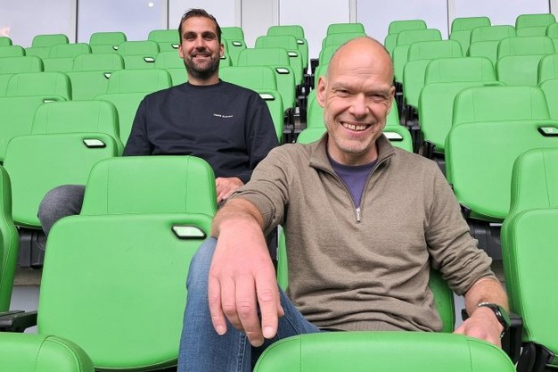 Wilco Noordhof (links) samen met Daniel Bies in de stoelen van het FC Groningen Stadion.