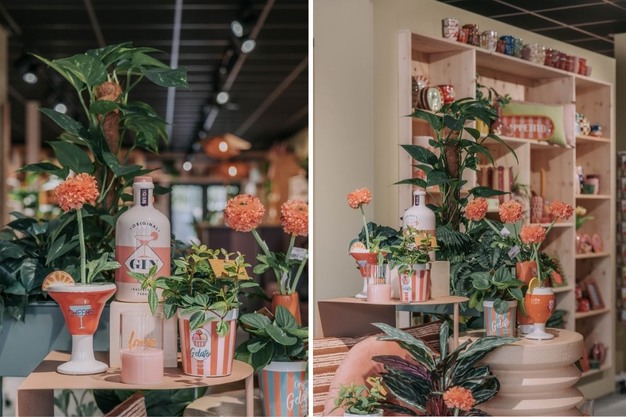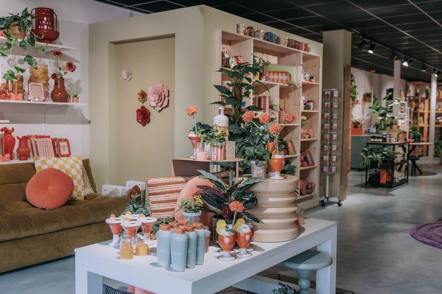 Dat is ook terug te zien in de etalage en de opstellingen in de winkel. Overal zie je zomerse accenten, denk aan gestreepte bloempotten in snoepkleuren, kunstbloemen met een knipoog naar cocktails en accessoires die je zo mee zou willen nemen naar een strandfeest. De kleur oranje speelt een subtiele hoofdrol, als zomerse energiebron die elke hoek van de winkel opfrist.