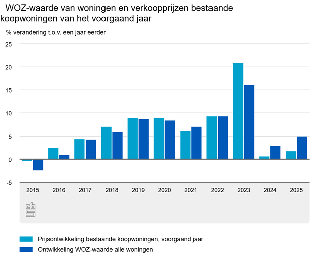 De WOZ-waarde volgt de prijsontwikkeling van bestaande koopwoningen met een jaar vertraging. Dit komt doordat woningen voor de WOZ in 2025 worden getaxeerd naar de waarde van 1 januari 2024. Hierbij gebruiken gemeenten onder andere de transactieprijzen van verkochte woningen.