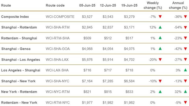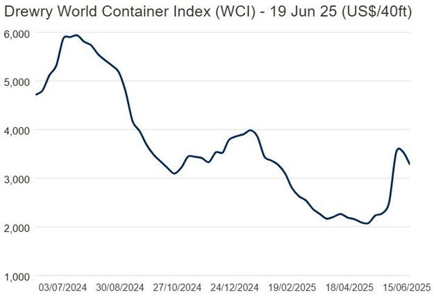 De wereldwijde containertarieven zijn deze week met 7% gedaald, zo blijkt uit de nieuwste cijfers van de World Container Index (WCI), een wekelijkse index van Drewry die de gemiddelde spotprijzen weergeeft voor het vervoer van een 40-voets container op belangrijke mondiale zeevaartroutes. Dit is de eerste daling in meer dan een maand, na zes opeenvolgende weken van stijgingen. De daling is vooral te wijten aan een teruglopende vraag naar vrachten richting de Verenigde Staten.