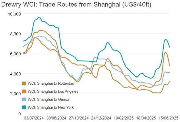 De tarieven op de belangrijke trans-Pacific-route van Shanghai naar New York daalden met 10% tot $6.584 per 40ft container. Ondanks deze terugval liggen de prijzen nog altijd 81% hoger dan zes weken geleden. Op de route naar Los Angeles zakten de tarieven zelfs met 20% deze week, hoewel ook daar nog altijd sprake is van een stijging van 73% ten opzichte van begin mei.