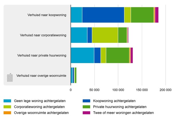 Een groot deel van de doorstromers blijft binnen dezelfde eigendomscategorie. Zo laat bijna de helft van de doorstromers in een koopwoning ook een koopwoning achter, en bijna 45 procent van de doorstromers in een corporatiewoning laat een corporatiewoning achter. Doorstromers in een private huurwoning laten vaak een niet-lege woning achter, maar ook vaak een private huurwoning.