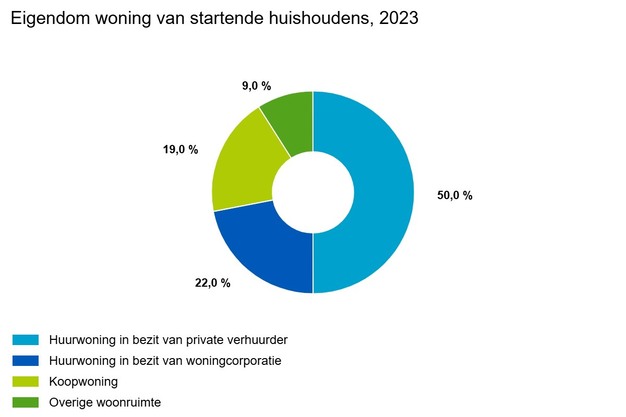 De helft van de huishoudens die starten op de woningmarkt begonnen in 2023 hun wooncarrière in een private huurwoning. Bijna een op de vijf startende huishoudens verhuisde naar een koopwoning. Dat meldt het CBS op basis van nieuwe cijfers.