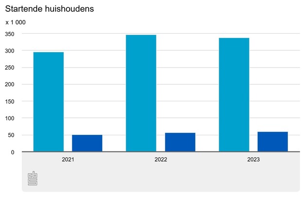 Tussen 2021 en 2023 steeg het aantal huishoudens van starters op de woningmarkt met 14 procent, van bijna 296 duizend naar ruim 338 duizend. In 2022 was er een kleine piek in het aantal startende huishoudens, voornamelijk door de toestroom van Oekraïense vluchtelingen. In het jaar daarna daalde het aantal startende huishoudens weer licht.