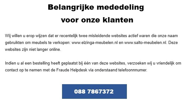 Twee valse webshops, elzinga-meubelen.nl en salto-meubelen.nl, boden onder hun naam meubels aan die Elzinga Wonen helemaal niet verkoopt. "Het ging vooral om tuinmeubelen die wij zelf niet eens verkopen. Ze werden voor een paar honderd euro aangeboden, terwijl die normaliter voor enkele duizenden euro worden verkocht", vertelt Uschi Elzinga in een interview met dagblad Tubantia.