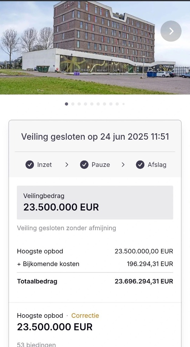 Het meest afgelegen en slecht beoordeelde hotel van Amsterdam, met 162 kamers, is via een online veiling verkocht voor een bedrag van €23,5 miljoen op dinsdag 24 juni 2025. De startprijs bij de veiling bedroeg €6,5 miljoen. In totaal zijn er 53 biedingen uitgebracht.