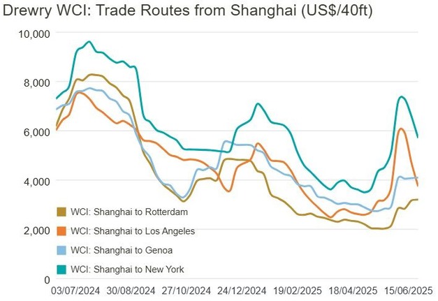 Volgens prognoses in Drewry's Container Forecaster zal het marktevenwicht in de tweede helft van 2025 verder verslechteren. Dat zal naar verwachting leiden tot een nieuwe daling van de spotprijzen. De mate van volatiliteit hangt af van politieke en juridische factoren, zoals de uitkomst van rechtszaken rond Amerikaanse importtarieven en mogelijke capaciteitsbeperkingen als gevolg van sancties tegen Chinese schepen.