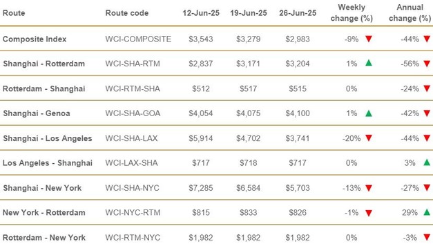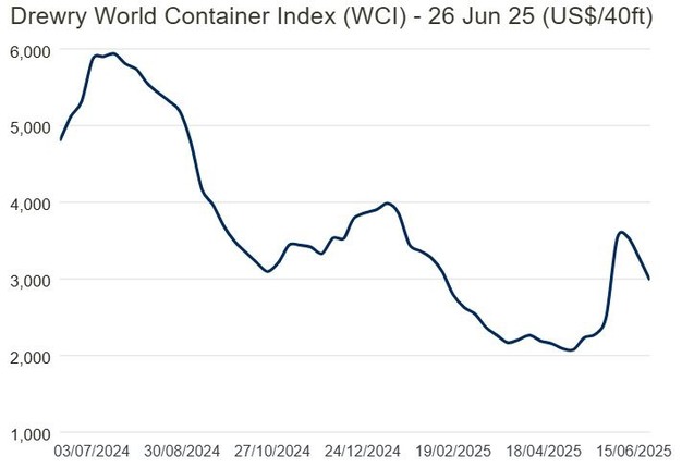 De wereldwijde containervervoertarieven zijn voor de tweede week op rij flink gedaald (9 procent). Dat blijkt uit de laatste cijfers van de World Container Index van Drewry, een wekelijkse index van Drewry die de gemiddelde spotprijzen weergeeft voor het vervoer van een 40-voets container op belangrijke mondiale zeevaartroutes. De gemiddelde prijs per 40 voet container kwam deze week uit op 2.983 dollar.