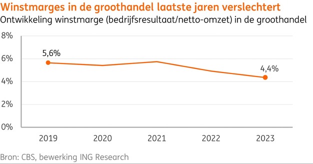 Een goede balans in de voorraden zorgt onder meer voor lagere opslag- en transportkosten, minder verspilling en een efficiënter werkkapitaalbeslag. Onder aan de streep leidt voorraadoptimalisatie dan ook tot betere winstmarges voor de groothandel. Deze waren in de afgelopen jaren juist verslechterd, onder andere door oplopende werkkapitaalkosten als gevolg van de omvangrijke voorraden in combinatie met een relatief hoge rente in 2023. Uit onze berekeningen blijkt dat wanneer de eindvoorraden met 10% afnemen, de winstmarge in de groothandel structureel met circa 0,65% verbetert. Dit lijkt relatief weinig, maar in absolute aantallen betreft het een enorme winstverbetering, zeker voor een sector met relatief dunne winstmarges.