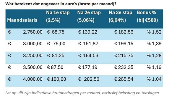 - 2,5% per direct (1 maand na ingang van de nieuwe cao)