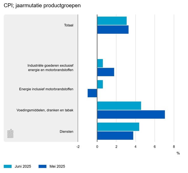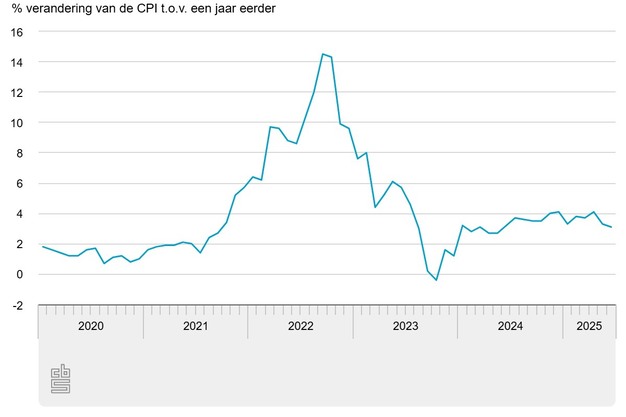 De inflatie in juni 2025 was 3,1 procent bij de snelle raming, meldt het CBS. Deze raming is berekend op basis van nog onvolledige brongegevens. In mei was de inflatie 3,3 procent.