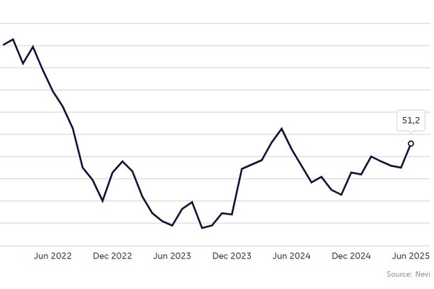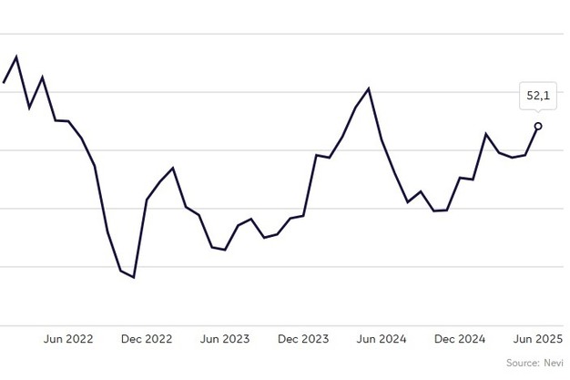 De Nevi Inkoopmanagersindex voor de Nederlandse industrie is over juni gestegen van 49,0 naar 51,2. Voor het eerst in een jaar tijd komt de score boven de 50 uit, waarmee de index wijst op groei van de bedrijvigheid. Ondanks de handelsoorlog met de Verenigde Staten zit het aantal nieuwe orders in de lift.