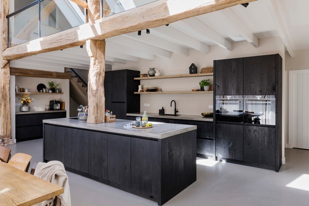 De keukens van Kral worden met de hand gemaakt in het eigen atelier. Daarbij wordt vooral gewerkt met eikenhout, maar ook materialen als wagonhout en notenhout vinden hun weg naar het ontwerp. "Dat zijn houtsoorten met karakter en geschiedenis", zegt Marian. "Ze geven de keuken een unieke en warme uitstraling." Geen standaardkeukens, maar ontwerpen die volledig passen bij de bewoners én het huis.