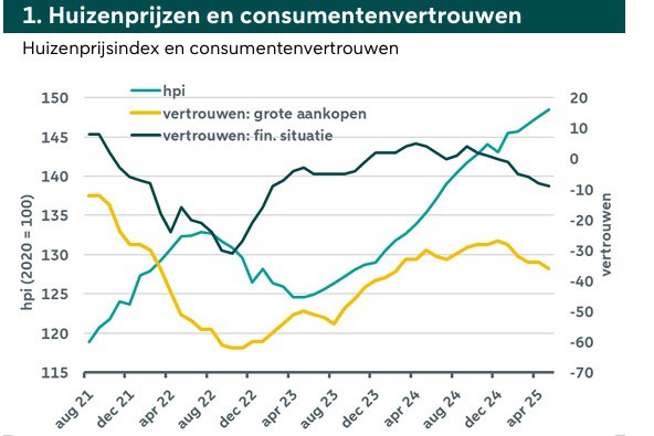 De Nederlandse woningmarkt toont veerkracht bij wereldwijde onzekerheid. Ook in het tweede kwartaal van dit jaar heeft de stijging van de woningprijzen doorgezet. De drijvende factoren achter de stijging blijven het stijgende inkomen van huishoudens (meer vraag) en het lage aantal opgeleverde nieuwbouwwoningen (laag aanbod). Daarnaast zagen we een lichte daling van de hypotheekrente, waardoor woningaankopen goedkoper te financieren zijn. Verrassend genoeg lijkt de wereldwijde economische onzekerheid rond conflicten en handelstarieven een kleinere rol te spelen dan verwacht. Hoewelhet consumentenvertrouwen laag is, suggereert de huizenprijsgroei dat de relatie tussen de twee verzwakt. De huizenprijzen zijn over de eerste vijf maanden met 6,6% gestegen ten opzichte van het gemiddelde prijsniveau van 2024. In verband met deze sterke stijging stellen we onze prijsprognose opwaarts bij naar 8% voor 2025 (was 7%). Hierbij gaan wij ervan uit dat de prijzen de rest van het jaar met gemiddeld met 0,25% per maand zullen blijven stijgen. Voor 2026 houden we onze prognose constant op 3% prijsgroei. De lagere groei komt door lagere loonstijgingen en het feit dat de hypotheekrente in 2026 niet nog verder zal dalen.