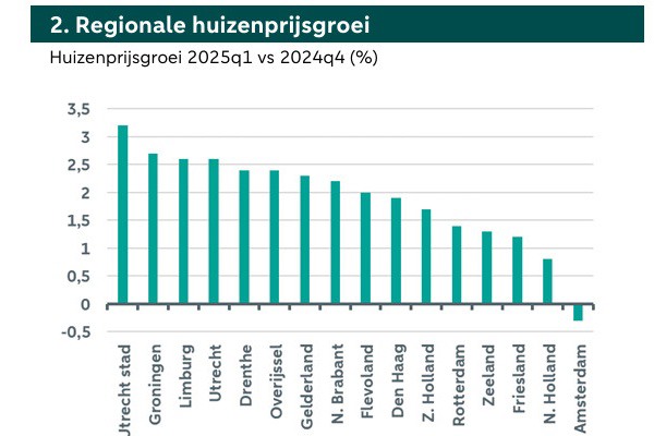 De prijsstijging is het hoogst in landelijke gebieden. Als we naar het onderliggende sentiment kijken, zien we dat hoekwoningen (2,4%), twee-onder-een kap (2,1%) en rijtjeshuizen (2,0%) het meest in prijs zijn gestegen in het eerste kwartaal van 2025. Appartementen (1,6%) en vrijstaande woningen (1,4%) groeiden het minst hard. Kijkend naar de grote vier steden en provincies, laat de stad Utrecht de hoogste prijsgroei zien (3,2%), gevolgd door de landelijke provincies Groningen (2,7%) en Limburg (2,6%). Amsterdam is hekkensluiter met een gemiddelde prijsdaling van 0,3%.