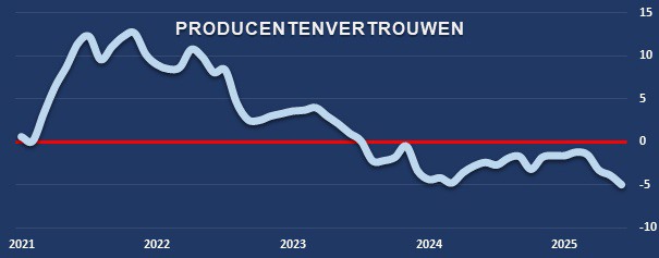 Het vertrouwen van fabrikanten verslechterde in juni voor de vierde maand op rij. Het producentenvertrouwen ging van -3,9 in mei naar -5,0 in juni, aldus het CBS. Dat komt vooral doordat producenten in de industrie minder positief waren over de verwachte productie en negatiever over hun orderportefeuille.