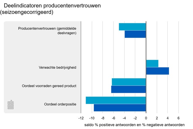 Een deelindicator was positief. Het aantal producenten dat verwacht dat hun productie de komende drie maanden zal toenemen was groter dan het aantal dat een afname van de productie voorziet. De andere twee deelindicatoren van het producentenvertrouwen waren negatief. Het aantal producenten dat de orderpositie groot acht, was kleiner dan het aantal dat de orderportefeuille klein vindt, gelet op de tijd van het jaar. Het aantal producenten dat de voorraad eindproduct als klein beschouwt, was kleiner dan het aantal dat de voorraden groot vindt.