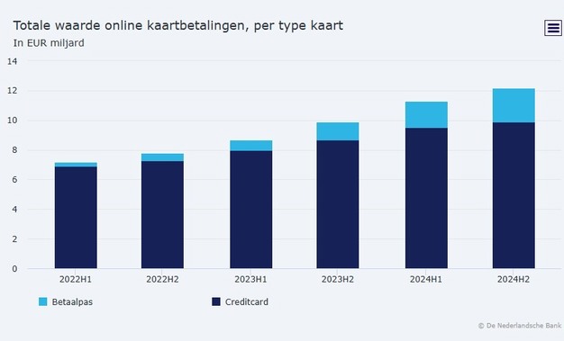 Daartegenover werden er in 2024 306 miljoen online kaartbetalingen gedaan met een waarde van € 24 miljard. Zo'n 230 miljoen van die online kaartbetalingen in 2024 werden met een creditcard gedaan, maar vooral de populariteit van betaalpassen voor online betalingen nam flink toe: tussen 2022 en 2024 verdrievoudigde dit aantal kaartbetalingen tot 76 miljoen transacties op jaarbasis.