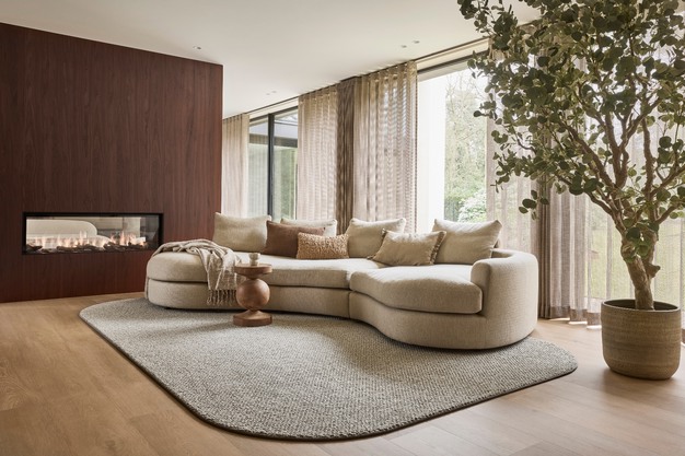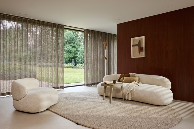 'Je kunt met de DESSO Wonderful Wool II collecties een natuurlijke sfeer creëren met een vloerkleed op maat; bijvoorbeeld in een Deens Ovaal, een vorm die steeds vaker wordt gespot in de interieurs van nu. Deze vorm geeft de zitkamer een vriendelijke en robuuste uitstraling. Het effect van dit naturelkleurige vloerkleed is dat het perfect 'blend' met de minimalistische natuurstenen vloer. De totale interieursfeer wordt zo warm en comfortabel.'