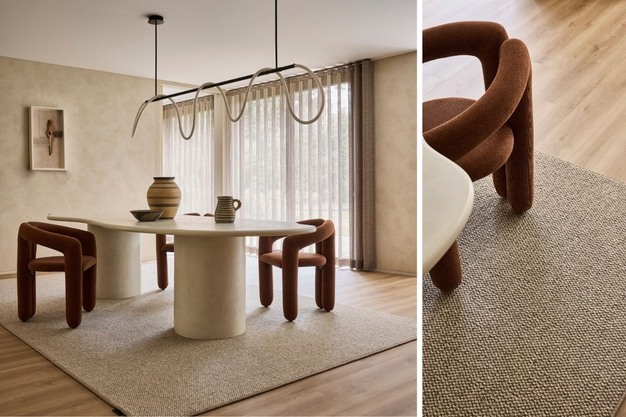 'In de nieuwste woontrends draait alles om sfeer en persoonlijkheid. Natuurlijke materialen en structuren brengen de natuur naar binnen en zorgen voor een prettig, warm gevoel in huis. Een houten vloer met daarop een wollen vloerkleed is dé combinatie voor extra comfort en sfeer. Ook in de eetkamer is een royaal vloerkleed uit een van de DESSO Wonderful Wool II collecties ideaal: het is stijlvol, comfortabel én maakt samen eten nog gezelliger. De bouclé structuur van de DESSO Liszt collectie sluit naadloos aan bij het nieuwe landelijk-moderne interieur met een 'quiet luxury' karakter.'