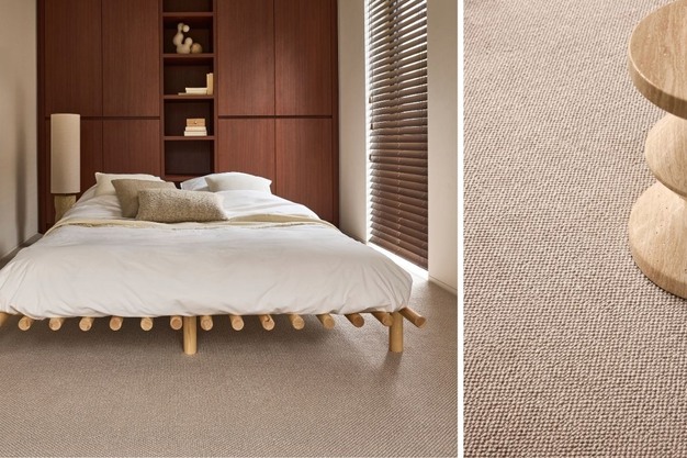 'De Japandi sfeer in deze slaapkamer krijgt een luxe look & feel dankzij het kamerbrede wollen DESSO Haydn tapijt. Deze basis creëert zachtheid, ruimtelijkheid en geeft de andere harde texturen zoals hout en steen een extra authentieke en ambachtelijke uitstraling. Met een wollen vloer voelt dit interieur ontspannen en warm aan. Stof en vuil worden door het tapijt goed opgevangen. Met stofzuigen verwijder je dit makkelijk weer zodat de luchtkwaliteit – zonder rondzwevende stofdeeltjes, in huis wordt verbeterd en je gezonder slaapt.'