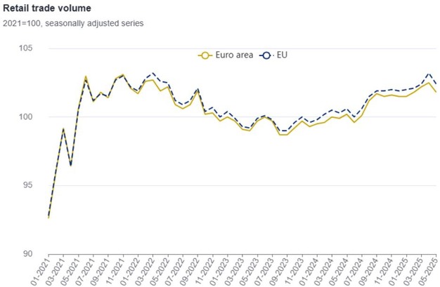 Volgens de eerste ramingen van Eurostat, het statistisch bureau van de Europese Unie, is het seizoensmatig aangepaste volume van de detailhandel in mei 2025 met 0,7% gedaald in de eurozone en met 0,8% in de gehele Europese Unie, vergeleken met april 2025. Daarmee wordt de positieve trend van april, toen het detailhandelsvolume met respectievelijk 0,3% (eurozone) en 0,8% (EU) steeg, onderbroken.