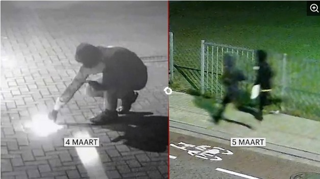Een etmaal later, op woensdag 5 maart rond 02.00 uur, zijn twee personen vastgelegd op camerabeelden bij hetzelfde bedrijfspand. Kort daarna brak een hevige brand uit, voorafgegaan door een explosie, die het gebouw volledig verwoestte. De verdachten vluchtten te voet. Beiden droegen donkere kleding, vermoedelijk een trainingsbroek en zwarte sneakers, en hadden een plastic tas bij zich.