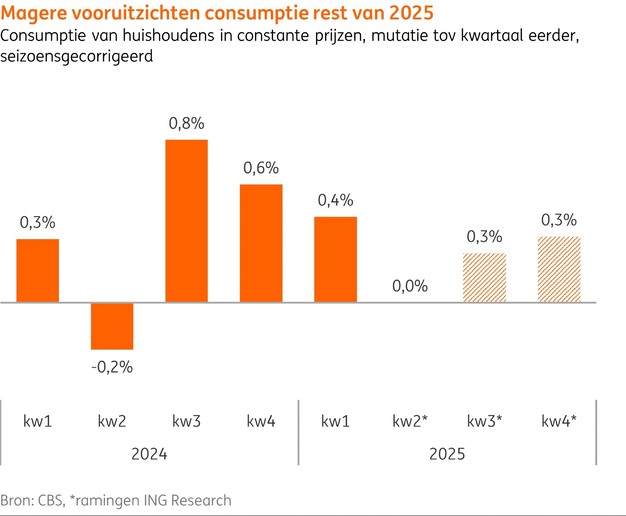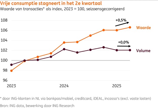 De Nederlandse consument heeft in het tweede kwartaal van 2025 nauwelijks meer gekocht dan in het kwartaal ervoor. Uit een analyse van ING-transactiedata blijkt dat consumenten iets minder goederen en iets meer diensten kochten. Per saldo is de totale vrije consumptie gestabiliseerd. Deze 'groei' van 0,0% betekent een zwak tweede kwartaal van de consument. Voor de tweede helft van dit jaar zijn de signalen gemengd en verwacht ING Research een gematigde consumptiegroei.