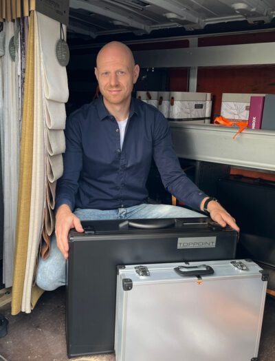Zijn bedrijfsbus is ingericht als mobiele showroom, met een breed scala aan stoffen, kleurstalen en voorbeeldproducten. Met een verrijdbaar kledingrek toont hij klanten op locatie diverse opties, van gordijnen tot plissés en horren. Alles wordt op maat geleverd en gemonteerd.