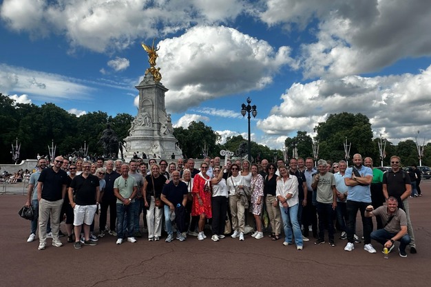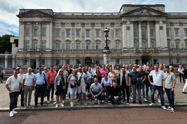 Het team van Cotap en de klanten van het bedrijf bij het Buckingham Palace tijdens de reis voor het 85-jarig bestaan.