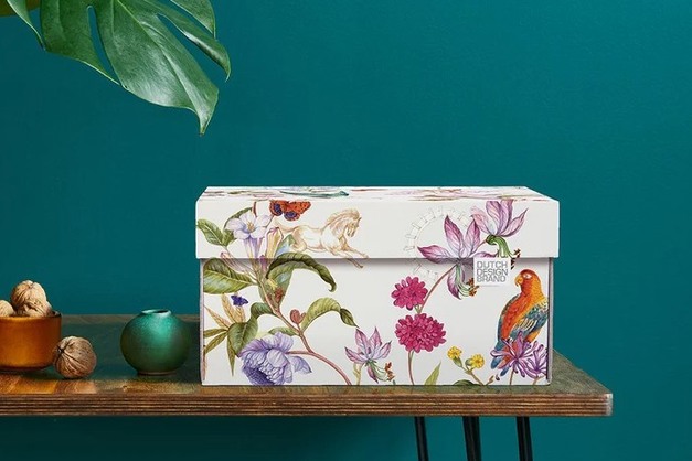 De Classic Storage Box is een stevige kartonnen opberger met een inhoud van 22 liter (38,9 x 31,3 x 20,6 cm). De boxen zijn gemaakt van FSC-gecertificeerd karton en bedrukt in full colour met een glans- of matlaminaat. Ze zijn stapelbaar, sluiten goed af en houden je spullen stofvrij. Verkrijgbaar voor € 20,95 per stuk via www.dutchdesignbrand.com en bij geselecteerde verkooppunten.