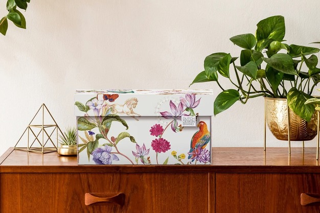 De Lavender Sky Storage Box voegt een zacht kleuraccent toe aan de ruimte, zonder daarbij overheersend te zijn. De lavendeltint werkt rustgevend en stimuleert creativiteit, terwijl de bloemen, vlinders en tropische vogels zorgen voor een vrolijk en luchtig detail. Gebruik de box voor je aquarel- of tekenspullen in je atelier of bewaar er andere creatieve materialen of papierwaren in. Hij komt mooi tot z'n recht op kantoor of in de woonkamer. Dankzij het subtiele kleurenpalet en speelse ontwerp past deze box perfect in een botanisch, Scandinavisch of eclectisch interieur.