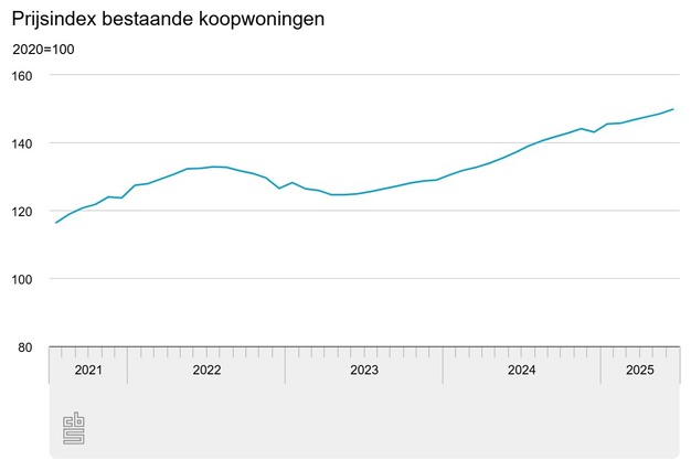 Ten opzichte van mei 2025 is de prijsindex bestaande koopwoningen in juni 2025 met 0,9 procent gestegen. De prijzen van bestaande koopwoningen bereikten in juli 2022 een piek. Daarna sloeg de trend om en daalde de prijsindex enige tijd. Sinds juni 2023 is de trend echter weer stijgend. In juni lagen de prijzen gemiddeld 12,7 procent hoger dan bij de vorige piek in juli 2022.
