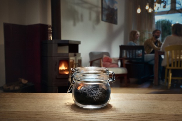 © Milieu CentraalVisualisatie (met behulp van grafiet) van de 28 gram fijnstof die gemiddeld bij een avondje hout stoken via de schoorsteen vrijkomt, (gemiddeld 7 gram per uur, gedurende 4 uur).
