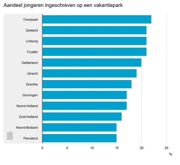 Van alle ingeschrevenen op een vakantiepark was 19 procent 25 jaar of jonger. In de provincie Overijssel was dit 22 procent. In Zeeland en Limburg was dit 21 procent.