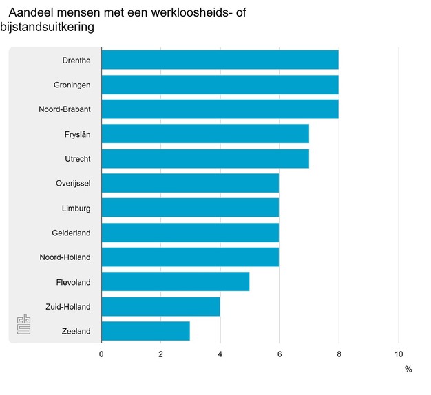 In Drenthe, Groningen en Noord-Brabant ontving 8 procent van de mensen op een vakantiepark een bijstandsuitkering en/of een werkloosheidsuitkering. In Zeeland was dit met 3 procent het laagst.