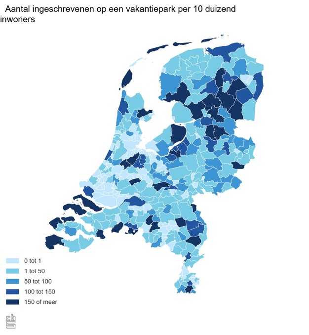 Noord-Beveland is de gemeente waar de meeste mensen op een vakantiepark staan ingeschreven; bijna 750 ingeschrevenen per 10 duizend inwoners. Ook in Baarle-Nassau en Ommen gaat het om relatief veel mensen. In absolute zin telt de gemeente Ommen de meeste mensen die op een vakantiepark wonen (1 230 mensen).