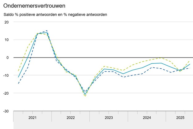 Tevens toonde de Conjunctuurenquête Nederland dat het ondernemersvertrouwen in het derde kwartaal van 2025 minder negatief werd. Het vertrouwen steeg van –7,5 naar –3,8, vrijwel gelijk aan het gemiddelde sinds 2012 (–3,7). De verbetering komt vooral doordat ondernemers minder negatief zijn over de vooruitzichten voor het economisch klimaat. In sectoren als vervoer en opslag steeg het vertrouwen het sterkst (van –12,0 naar –0,9) en in de zakelijke dienstverlening sloeg het om naar positief (van –4,1 naar 0,6). Andere sectoren, zoals landbouw, bosbouw en visserij, bleven echter het meest negatief Centraal Bureau voor de Statistiek Centraal Bureau voor de Statistiek.