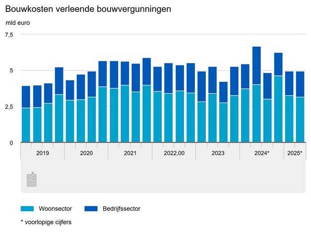 In het tweede kwartaal waren de vergunde bouwkosten voor alle woningen 3,2 miljard euro. Dat is 21 procent minder dan in hetzelfde kwartaal van 2024. De informatie over vergunde bouwkosten komt uit enquêtes. Voor bedrijfsgebouwen waren de vergunde bouwkosten in het tweede kwartaal 1,8 miljard euro, dit is 33 procent lager dan in hetzelfde kwartaal een jaar eerder.