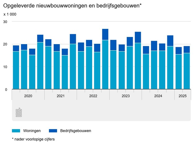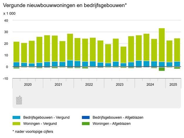 In het tweede kwartaal van 2025 werden voor de nieuwbouw van 20 duizend woningen vergunningen afgegeven. Dat zijn er 3,3 duizend minder dan in dezelfde periode vorig jaar. Dat meldt het CBS op basis van nieuwe kwartaalcijfers over de bouw. Dit kwartaal werden voor de nieuwbouw van 4,7 duizend bedrijfsgebouwen vergunningen afgegeven, 600 minder dan in dezelfde periode vorig jaar.