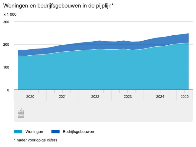 De pijplijn geeft aan hoeveel woningen en bedrijfsgebouwen een vergunning hebben voor nieuwbouw, maar nog niet klaar zijn. De aantallen in de pijplijn nemen toe als er in een periode meer woningen of bedrijfsgebouwen worden vergund dan opgeleverd. De laatste jaren neemt de pijplijn toe, ook gecorrigeerd voor het aantal afgeblazen bouwprojecten. Het aantal nieuwbouwwoningen in de pijplijn is in het tweede kwartaal van 2025 met 3,1 duizend gestegen. Voor bedrijfsgebouwen was er een toename van 1,6 duizend.