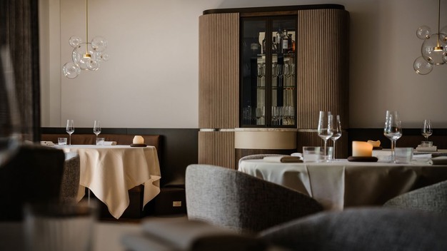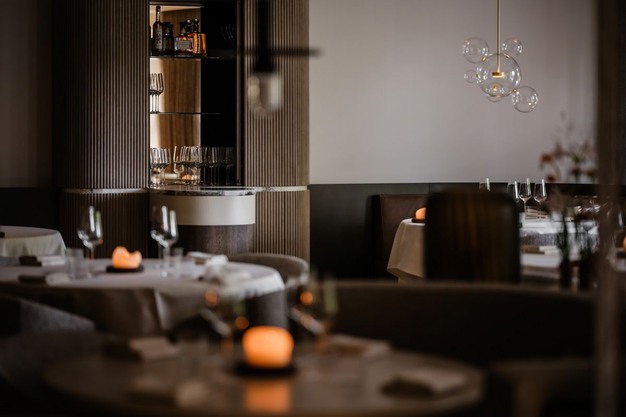 Het aantal tafels is iets teruggebracht en tegelijkertijd zijn de tafels vergroot, wat resulteert in meer ruimte en privacy voor de gast. Het restaurant biedt nu plaats aan maximaal 40 gasten. In de hoeken zijn halfronde banken geplaatst die een gevoel van geborgenheid creëren. De comfortabele stoelen zijn van Minotti en blikvangers zijn onder meer de prachtige hanglampen van Giopato & Coombes, die bestaan uit handgeblazen glazen bollen. Boven de trap in de ontvangsthal hangt een metershoge op maat gemaakte lamp met cilindervormige glazen van hetzelfde merk.