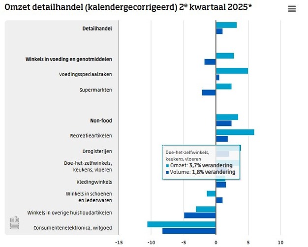In het tweede kwartaal steeg de omzet van winkels in voeding en genotmiddelen met 2,8 procent vergeleken met een jaar eerder. Supermarkten (2,5 procent) en voedingsspeciaalzaken (5 procent), zoals kaaswinkels en slagerijen, haalden een hogere omzet. Dit komt door prijsstijgingen, de volumeontwikkelingen van de supermarkten (-2,1 procent) en de voedingsspeciaalzaken (0,6 procent) bleven achter. De cijfers zijn gecorrigeerd voor kalendereffecten.