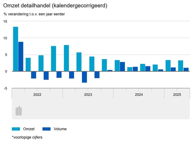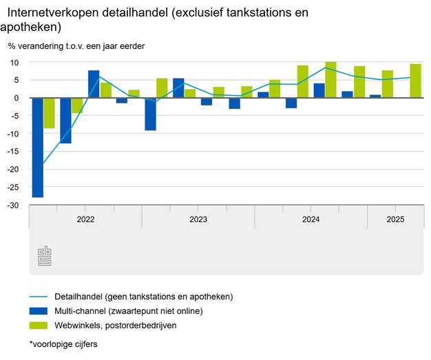 In het tweede kwartaal van 2025 nam de online omzet van detailhandelaren toe met 5,6 procent vergeleken met dezelfde periode een jaar eerder. Bij winkels die uitsluitend online verkopen groeide de omzet met 9,6 procent. Bij multichannelers, detaillisten die hun producten zowel online aanbieden als via een fysieke winkel, bleef de omzet met een ontwikkeling van 0,1 procent nagenoeg gelijk.