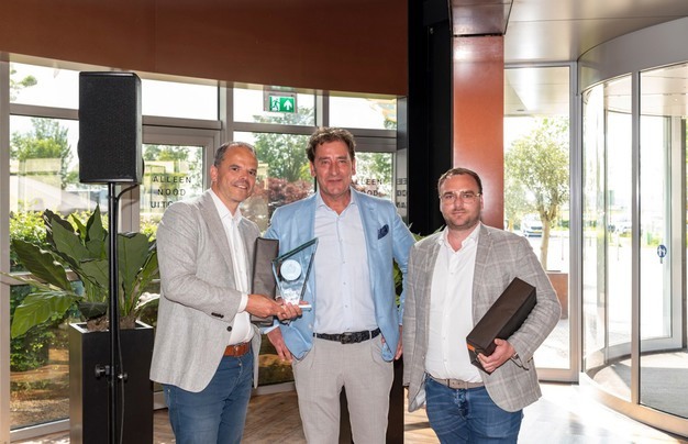 (Links) Marcel Hoogendoorn, nieuwe CEO BuitenHof Tuinmeubelen, nam de Dofas Pluim 2023 in ontvangst van Frits Wolf (midden). Rechts Chris van Rijn van Postmus Tuinmeubelen, die destijds ook genomineerd was voor de Dofas Pluim.