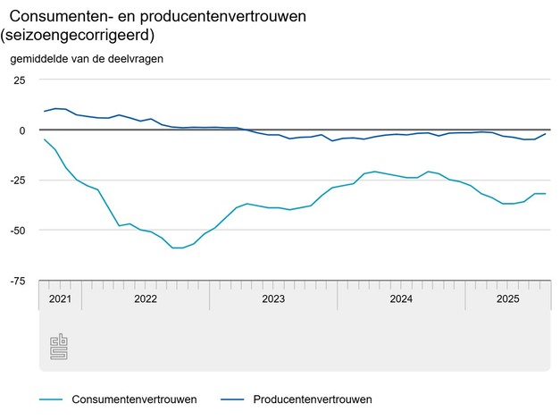 Consumentenvertrouwen even negatief, producenten minder negatief