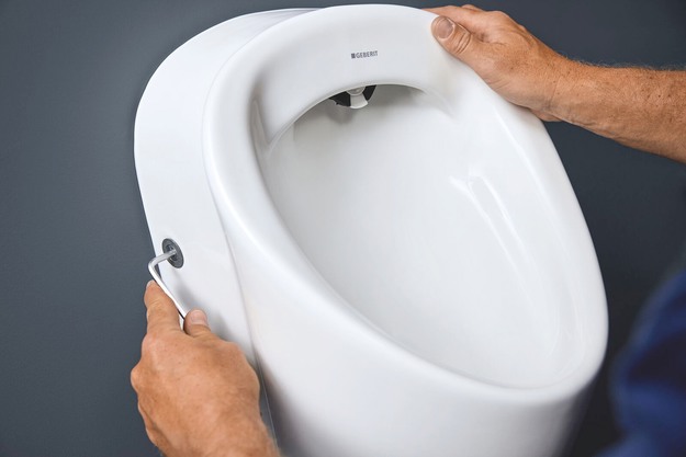 Een interdisciplinair Geberit team van kunststofexperts uit Rapperswil-Jona (CH) en keramiekspecialisten uit Koło (PL) heeft maandenlang gewerkt aan de ontwikkeling van het perfecte urinoir. Dankzij de nieuwe spoelverdeler is een schone spoeling met slechts 0,5 liter water mogelijk. Wat deze innovatie uniek maakt, is dat bij het activeren van de spoeling het uitstromende water in de verdeler een klep opent, waarna het water gelijkmatig door het keramiek wordt geleid. Zodra de waterdruk afneemt, sluit de klep weer en daarmee ook de spoelverdeler, waardoor er geen water nadruppelt en er geen kalkaanslag ontstaat.