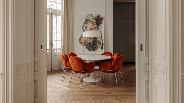 Architectonisch is het pand een blikvanger. De klassieke gevel met sierlijke ornamenten en grote raampartijen straalt grandeur uit. Binnen combineert het interieur moeiteloos modern comfort met historische charme. De ruime woonkamer biedt uitzicht op de levendige straten van Amsterdam, terwijl de eetkamer en woonkeuken zijn uitgerust met hoogwaardige materialen zoals marmer en luxe inbouwapparatuur.