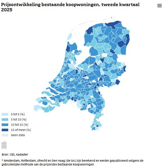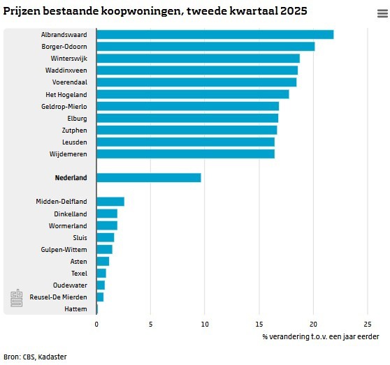 De transactieprijzen van bestaande koopwoningen waren in het tweede kwartaal van 2025 in alle gemeenten in Nederland hoger dan een jaar eerder. De prijsstijging was in Albrandswaard het grootst. Dit blijkt uit nieuwe van het CBS en het Kadaster.