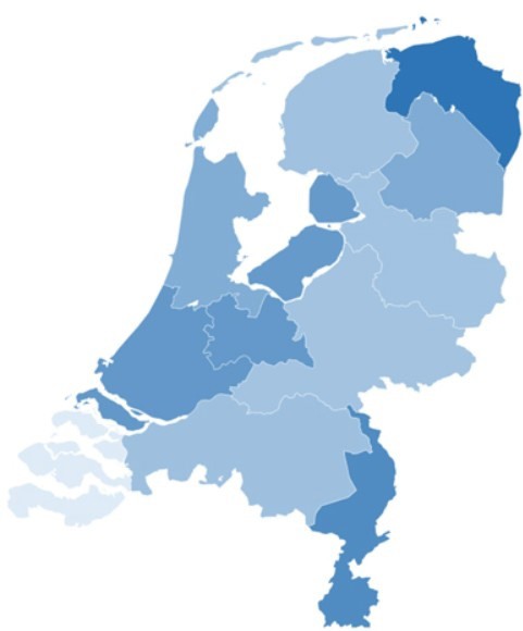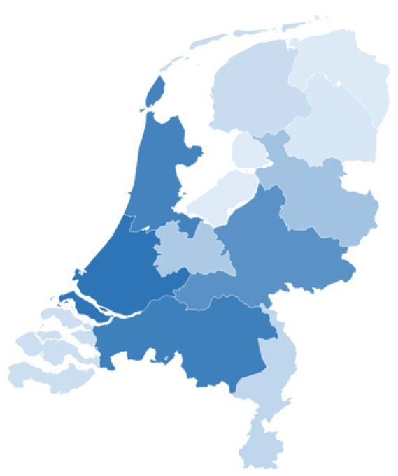 Onderstaand figuur geeft geografisch weer in welke provincies de meeste keukenzaken zijn gevestigd. Hoe blauwer een provincie is gekleurd, des te meer keukenzaken er zijn gevestigd.